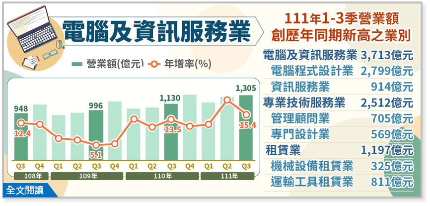 1.111年第3季電腦及資訊服務業營業額1,305億元,為歷年同季新高,年增15.4%,其中電腦程式設計業984億元,年增15.8%,主因資訊系統整合服務、網路數據交換應用需求升高,以及遊戲軟體設計業績提升所致;資訊服務業321億元,年增14.2%,主因拍賣平台網站管理業者拓展服務據點及推出促銷活動,帶動抽成營收成長,加以雲端電腦資料保管等業績攀升所致。